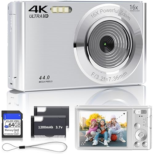 SMARTKLIK Digital Camera 2025 4K 44MP for Teens, Silver Point & Shoot with 16X Zoom, 64GB SD Card, Compact Camera for Boys, Girls, Teens & Kids Gift